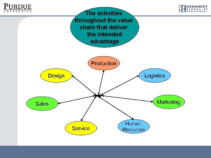 The activities throughout the value chain that deliver the intended advantage Production Design Logistics Marketing Sales Service Human Resources