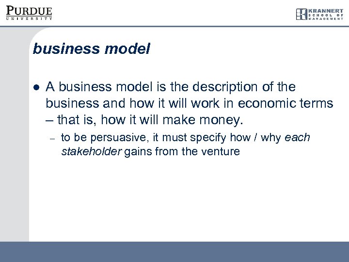 business model l A business model is the description of the business and how it will work in economic terms – that is, how it will make money. – to be persuasive, it must specify how / why each stakeholder gains from the venture