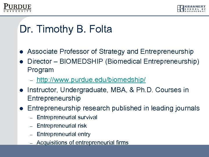 Dr. Timothy B. Folta l l Associate Professor of Strategy and Entrepreneurship Director – BIOMEDSHIP (Biomedical Entrepreneurship) Program – http: //www. purdue. edu/biomedship/ Instructor, Undergraduate, MBA, & Ph. D. Courses in Entrepreneurship research published in leading journals – – Entrepreneurial survival Entrepreneurial risk Entrepreneurial entry Acquisitions of entrepreneurial firms