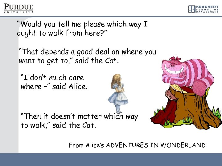 “Would you tell me please which way I ought to walk from here? ” “That depends a good deal on where you want to get to, ” said the Cat. “I don’t much care where –” said Alice. “Then it doesn’t matter which way to walk, ” said the Cat. From Alice’s ADVENTURES IN WONDERLAND