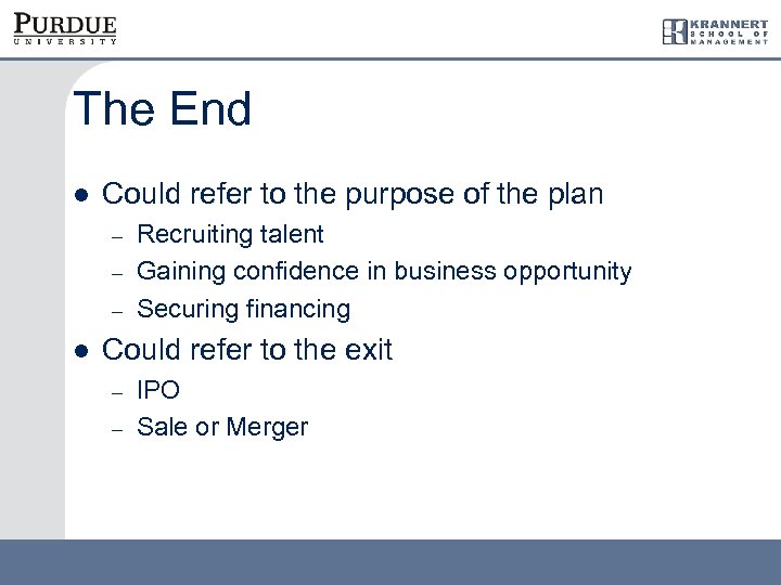 The End l Could refer to the purpose of the plan – – – l Recruiting talent Gaining confidence in business opportunity Securing financing Could refer to the exit – – IPO Sale or Merger