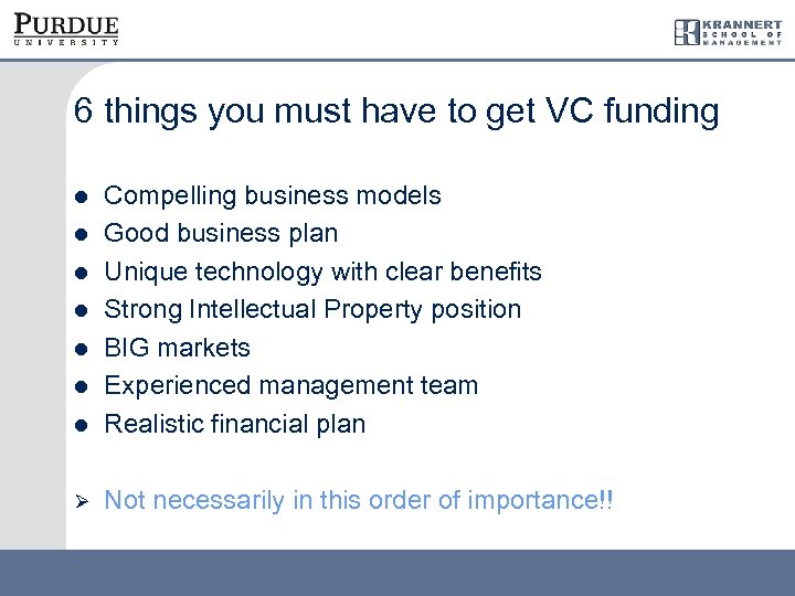 6 things you must have to get VC funding l Compelling business models Good business plan Unique technology with clear benefits Strong Intellectual Property position BIG markets Experienced management team Realistic financial plan Ø Not necessarily in this order of importance!! l l l