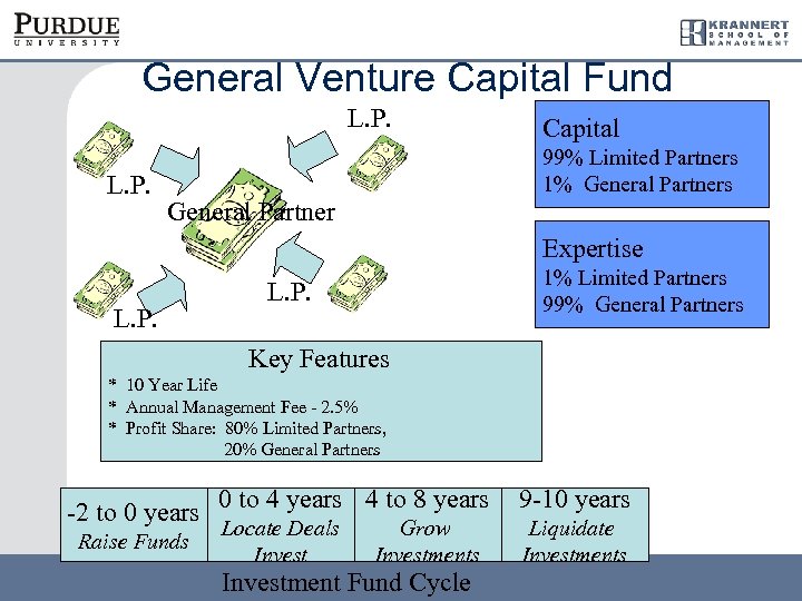 General Venture Capital Fund L. P. Capital 99% Limited Partners 1% General Partners General Partner Expertise L. P. 1% Limited Partners 99% General Partners L. P. Key Features * 10 Year Life * Annual Management Fee - 2. 5% * Profit Share: 80% Limited Partners, 20% General Partners -2 to 0 years 0 to 4 years 4 to 8 years Raise Funds Locate Deals Invest Grow Investments Investment Fund Cycle 9 -10 years Liquidate Investments