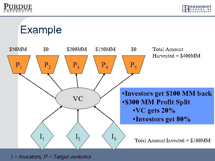 Example $50 MM $0 $200 MM $150 MM $0 P 1 P 2 P 3 P 4 P 5 • Investors get $100 MM back • $300 MM Profit Split • VC gets 20% • Investors get 80% VC I 1 I 2 I = Investors, P = Target ventures Total Amount Harvested = $400 MM I 3 Total Amount Invested = $100 MM