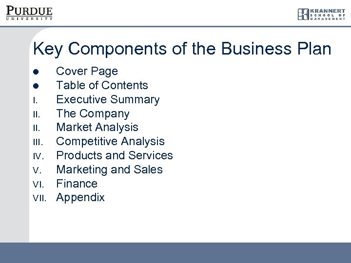 Key Components of the Business Plan l l I. II. III. IV. V. VII. Cover Page Table of Contents Executive Summary The Company Market Analysis Competitive Analysis Products and Services Marketing and Sales Finance Appendix