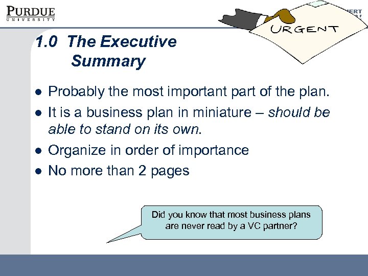 1. 0 The Executive Summary l l Probably the most important part of the plan. It is a business plan in miniature – should be able to stand on its own. Organize in order of importance No more than 2 pages Did you know that most business plans are never read by a VC partner?