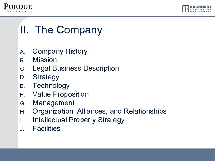 II. The Company A. B. C. D. E. F. G. H. I. J. Company History Mission Legal Business Description Strategy Technology Value Proposition Management Organization, Alliances, and Relationships Intellectual Property Strategy Facilities