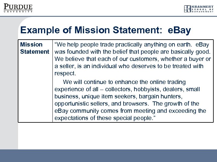 Example of Mission Statement: e. Bay Mission “We help people trade practically anything on earth. e. Bay Statement was founded with the belief that people are basically good. We believe that each of our customers, whether a buyer or a seller, is an individual who deserves to be treated with respect. We will continue to enhance the online trading experience of all – collectors, hobbyists, dealers, small business, unique item seekers, bargain hunters, opportunistic sellers, and browsers. The growth of the e. Bay community comes from meeting and exceeding the expectations of these special people. ”
