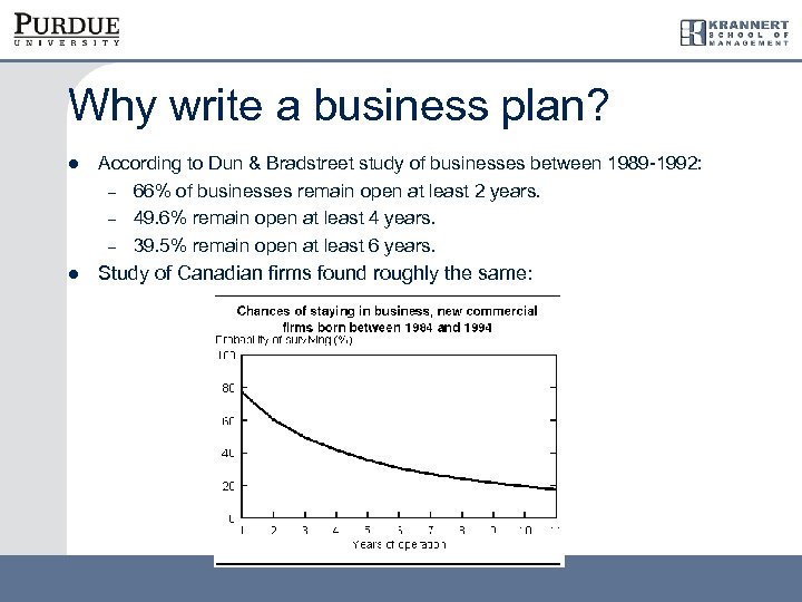 Why write a business plan? l According to Dun & Bradstreet study of businesses between 1989 -1992: – 66% of businesses remain open at least 2 years. – 49. 6% remain open at least 4 years. – 39. 5% remain open at least 6 years. l Study of Canadian firms found roughly the same:
