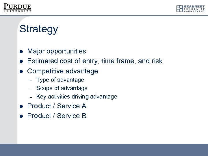 Strategy l l l Major opportunities Estimated cost of entry, time frame, and risk Competitive advantage – – – l l Type of advantage Scope of advantage Key activities driving advantage Product / Service A Product / Service B