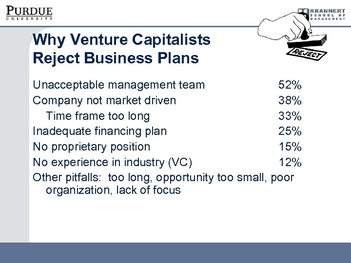 Why Venture Capitalists Reject Business Plans Unacceptable management team 52% Company not market driven 38% Time frame too long 33% Inadequate financing plan 25% No proprietary position 15% No experience in industry (VC) 12% Other pitfalls: too long, opportunity too small, poor organization, lack of focus