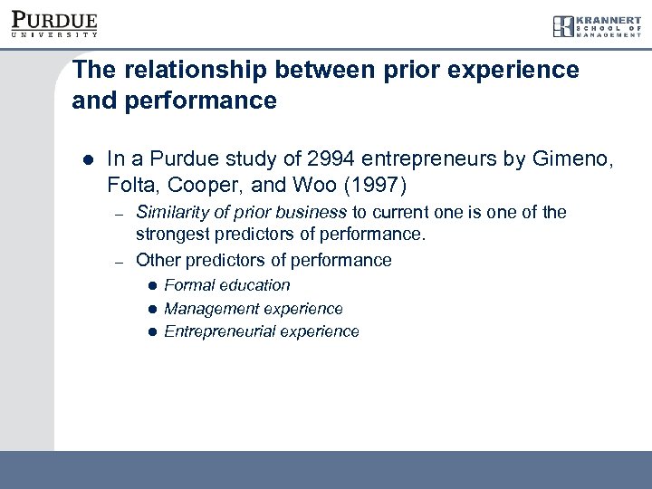 The relationship between prior experience and performance l In a Purdue study of 2994 entrepreneurs by Gimeno, Folta, Cooper, and Woo (1997) – – Similarity of prior business to current one is one of the strongest predictors of performance. Other predictors of performance Formal education l Management experience l Entrepreneurial experience l