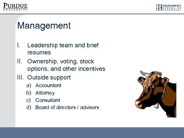 Management I. Leadership team and brief resumes II. Ownership, voting, stock options, and other incentives III. Outside support a) b) c) d) Accountant Attorney Consultant Board of directors / advisors