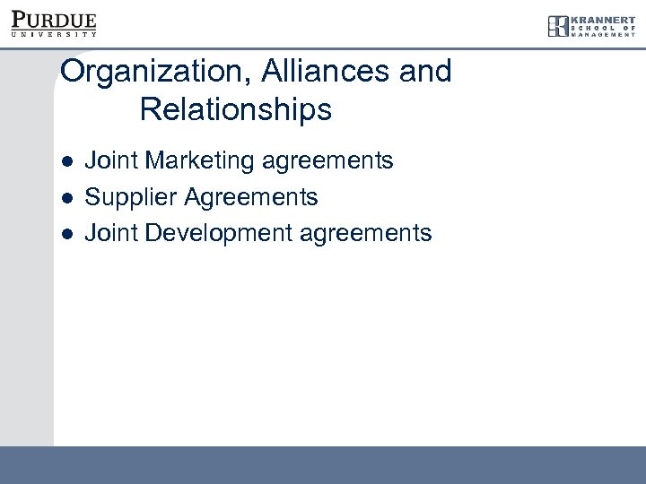 Organization, Alliances and Relationships l l l Joint Marketing agreements Supplier Agreements Joint Development agreements