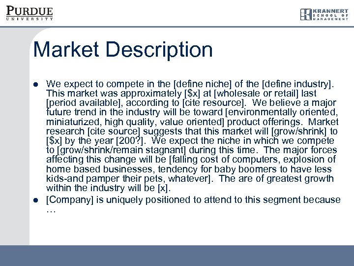 Market Description l l We expect to compete in the [define niche] of the [define industry]. This market was approximately [$x] at [wholesale or retail] last [period available], according to [cite resource]. We believe a major future trend in the industry will be toward [environmentally oriented, miniaturized, high quality, value oriented] product offerings. Market research [cite source] suggests that this market will [grow/shrink] to [$x] by the year [200? ]. We expect the niche in which we compete to [grow/shrink/remain stagnant] during this time. The major forces affecting this change will be [falling cost of computers, explosion of home based businesses, tendency for baby boomers to have less kids-and pamper their pets, whatever]. The are of greatest growth within the industry will be [x]. [Company] is uniquely positioned to attend to this segment because …