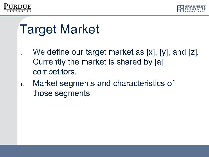 Target Market i. ii. We define our target market as [x], [y], and [z]. Currently the market is shared by [a] competitors. Market segments and characteristics of those segments