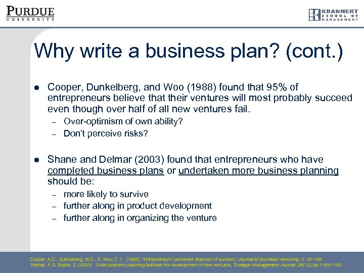 Why write a business plan? (cont. ) l Cooper, Dunkelberg, and Woo (1988) found that 95% of entrepreneurs believe that their ventures will most probably succeed even though over half of all new ventures fail. – – l Over-optimism of own ability? Don’t perceive risks? Shane and Delmar (2003) found that entrepreneurs who have completed business plans or undertaken more business planning should be: – – – more likely to survive further along in product development further along in organizing the venture Cooper, A. C. , Dunkelberg, W. C. , & Woo, C. Y. (1988). ‘Entrepreneurs’ perceived chances of success. ’ Journal of Business Venturing, 3: 97 -108. Delmar, F. & Shane, S. (2003). ‘Does business planning facilitate the development of new ventures, Strategic Management Journal, 24(12), pp 1165 -1185.