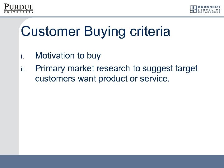 Customer Buying criteria i. ii. Motivation to buy Primary market research to suggest target customers want product or service.