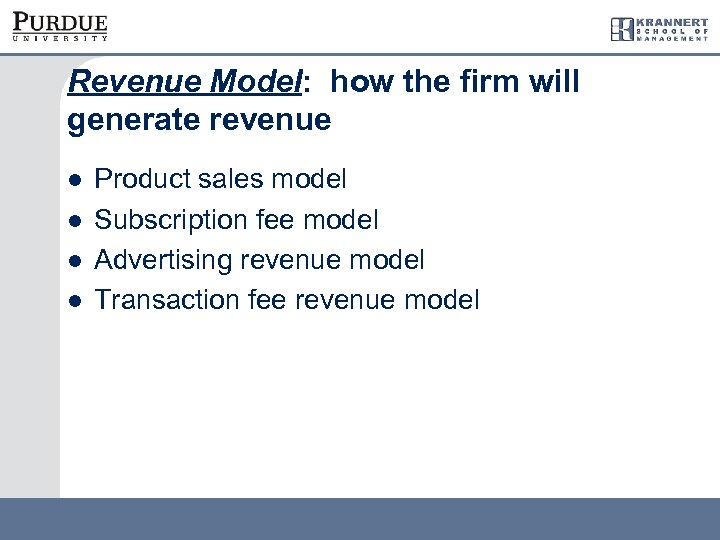 Revenue Model: how the firm will generate revenue l l Product sales model Subscription fee model Advertising revenue model Transaction fee revenue model