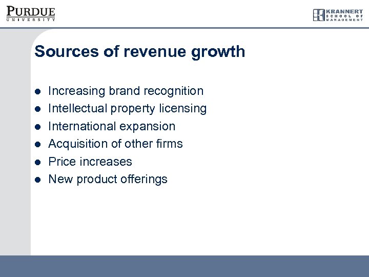 Sources of revenue growth l l l Increasing brand recognition Intellectual property licensing International expansion Acquisition of other firms Price increases New product offerings