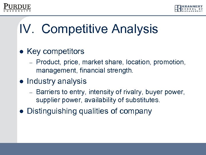 IV. Competitive Analysis l Key competitors – l Industry analysis – l Product, price, market share, location, promotion, management, financial strength. Barriers to entry, intensity of rivalry, buyer power, supplier power, availability of substitutes. Distinguishing qualities of company