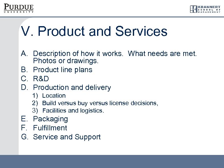 V. Product and Services A. Description of how it works. What needs are met. Photos or drawings. B. Product line plans C. R&D D. Production and delivery 1) Location 2) Build versus buy versus license decisions, 3) Facilities and logistics. E. Packaging F. Fulfillment G. Service and Support