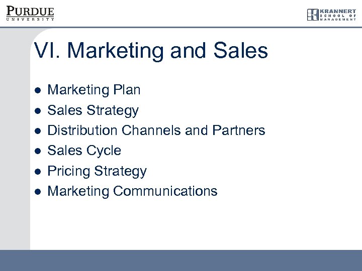 VI. Marketing and Sales l l l Marketing Plan Sales Strategy Distribution Channels and Partners Sales Cycle Pricing Strategy Marketing Communications