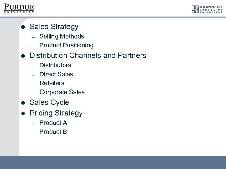 l Sales Strategy – – l Distribution Channels and Partners – – l l Selling Methods Product Positioning Distributors Direct Sales Retailers Corporate Sales Cycle Pricing Strategy – – Product A Product B