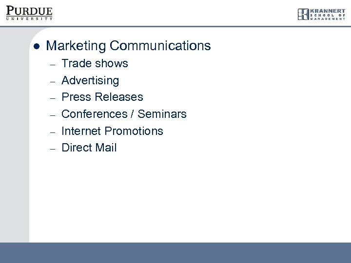 l Marketing Communications – – – Trade shows Advertising Press Releases Conferences / Seminars Internet Promotions Direct Mail