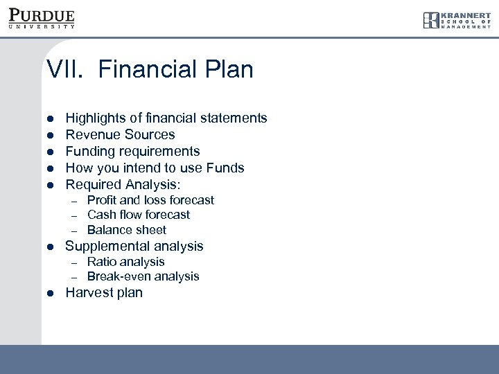 VII. Financial Plan l l l Highlights of financial statements Revenue Sources Funding requirements How you intend to use Funds Required Analysis: – – – l Supplemental analysis – – l Profit and loss forecast Cash flow forecast Balance sheet Ratio analysis Break-even analysis Harvest plan