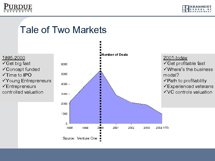 Tale of Two Markets 1995 -2000 üGet big fast üConcept funded üTime to IPO üYoung Entrepreneurs üEntrepreneurs controlled valuation 2001 -today üGet profitable fast üWhere’s the business model? üPath to profitability üExperienced veterans üVC controls valuation Source: Venture One