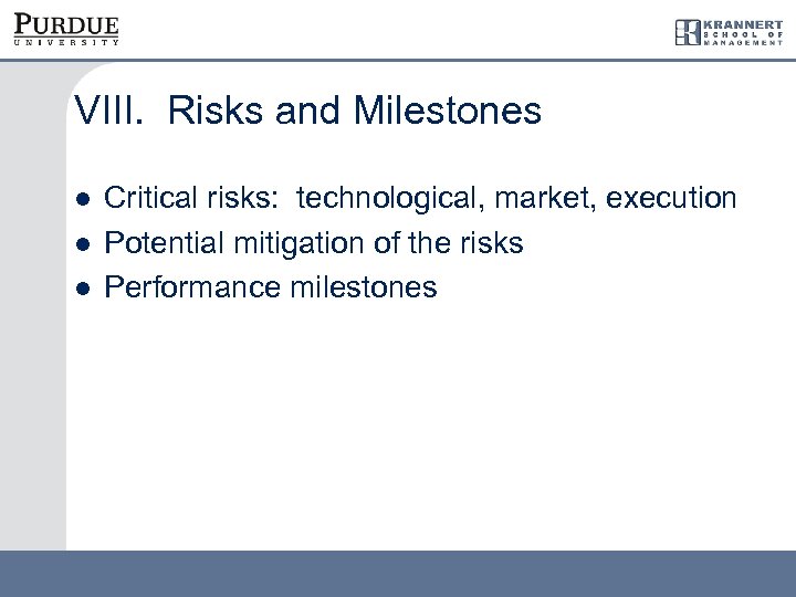 VIII. Risks and Milestones l l l Critical risks: technological, market, execution Potential mitigation of the risks Performance milestones