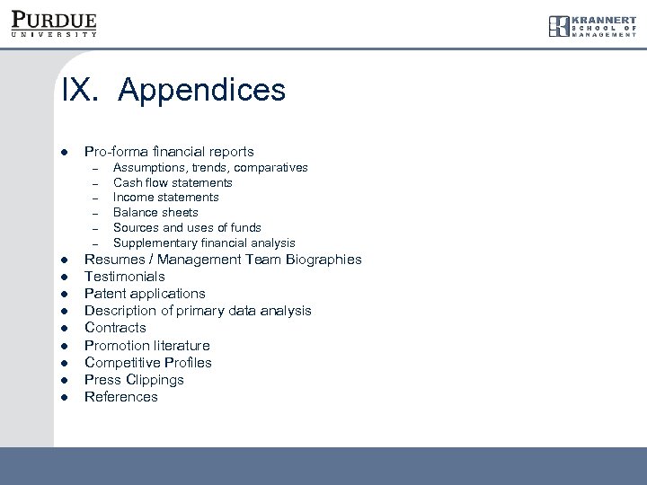 IX. Appendices l Pro-forma financial reports – – – l l l l l Assumptions, trends, comparatives Cash flow statements Income statements Balance sheets Sources and uses of funds Supplementary financial analysis Resumes / Management Team Biographies Testimonials Patent applications Description of primary data analysis Contracts Promotion literature Competitive Profiles Press Clippings References