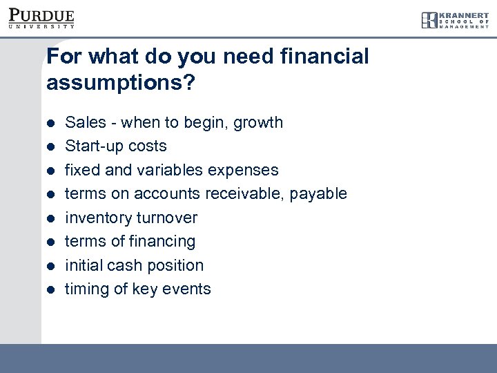 For what do you need financial assumptions? l l l l Sales - when to begin, growth Start-up costs fixed and variables expenses terms on accounts receivable, payable inventory turnover terms of financing initial cash position timing of key events