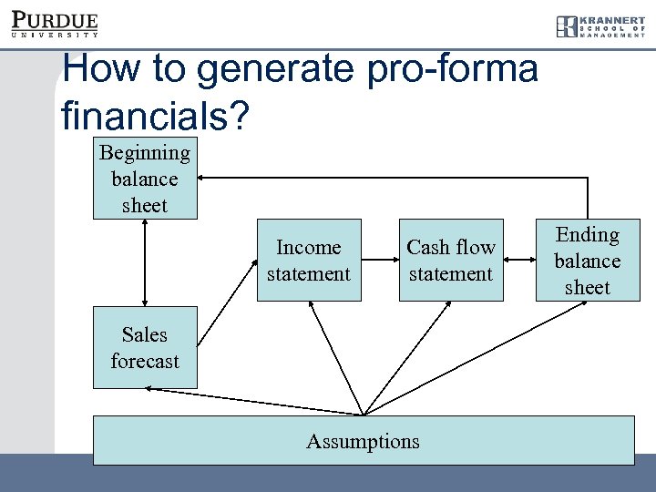 How to generate pro-forma financials? Beginning balance sheet Income statement Cash flow statement Sales forecast Assumptions Ending balance sheet