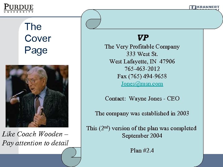 The Cover Page VP The Very Profitable Company 333 West St. West Lafayette, IN 47906 765 -463 -2012 Fax (765) 494 -9658 Jones@msn. com Contact: Wayne Jones - CEO The company was established in 2003 Like Coach Wooden – Pay attention to detail This (2 nd) version of the plan was completed September 2004 Plan #2. 4