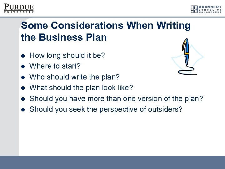 Some Considerations When Writing the Business Plan l l l How long should it be? Where to start? Who should write the plan? What should the plan look like? Should you have more than one version of the plan? Should you seek the perspective of outsiders?