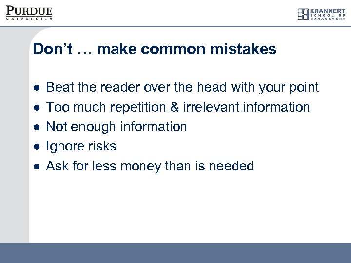 Don’t … make common mistakes l l l Beat the reader over the head with your point Too much repetition & irrelevant information Not enough information Ignore risks Ask for less money than is needed