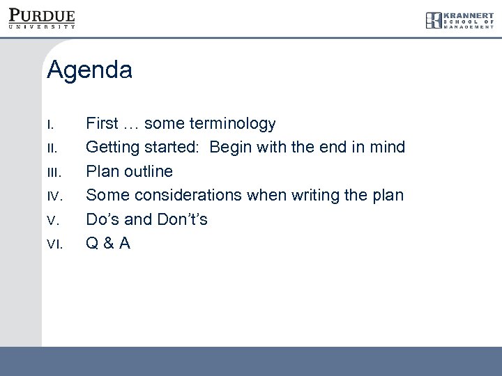 Agenda I. III. IV. V. VI. First … some terminology Getting started: Begin with the end in mind Plan outline Some considerations when writing the plan Do’s and Don’t’s Q&A