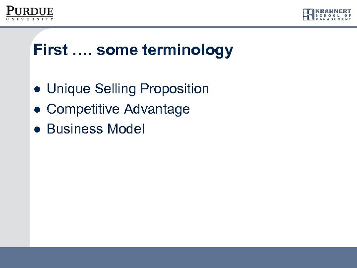First …. some terminology l l l Unique Selling Proposition Competitive Advantage Business Model