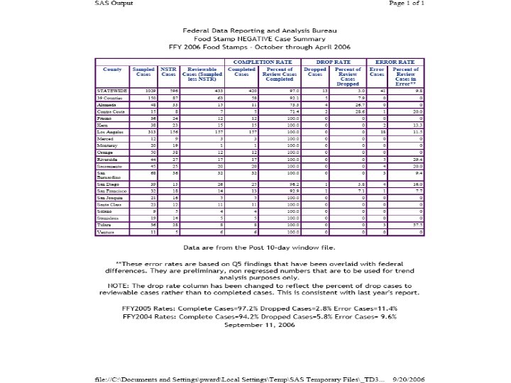 Status • A Corrective Action Plan is required if the negative rate is above one percent. • Currently, forty-six states have a negative error rate above one percent. • California submitted a CAP with the goal for FFY 2006 of a ten percent state reported rate. • Current rate through April is 9. 76%.