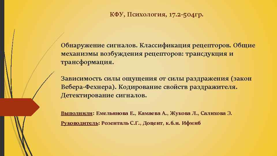 КФУ, Психология, 17. 2 -504 гр. Обнаружение сигналов. Классификация рецепторов. Общие механизмы возбуждения рецепторов: трансдукция и трансформация. Зависимость силы ощущения от силы раздражения (закон Вебера-Фехнера). Кодирование свойств раздражителя. Детектирование сигналов. Выполнили: Емельянова Е. , Камаева А. , Жукова Л. , Салихова Э. Руководитель: Розенталь С. Г. , Доцент, к. б. н. Ифмиб