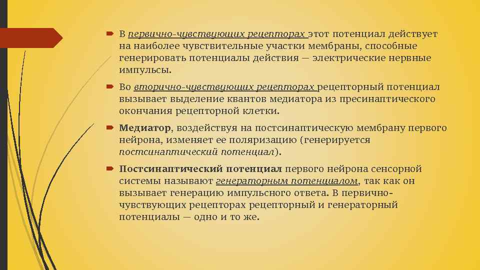 В первично-чувствующих рецепторах этот потенциал действует на наиболее чувствительные участки мембраны, способные генерировать потенциалы действия — электрические нервные импульсы. Во вторично-чувствующих рецепторах рецепторный потенциал вызывает выделение квантов медиатора из пресинаптического окончания рецепторной клетки. Медиатор, воздействуя на постсинаптическую мембрану первого нейрона, изменяет ее поляризацию (генерируется постсинаптический потенциал). Постсинаптический потенциал первого нейрона сенсорной системы называют генераторным потенциалом, так как он вызывает генерацию импульсного ответа. В первичночувствующих рецепторах рецепторный и генераторный потенциалы — одно и то же.