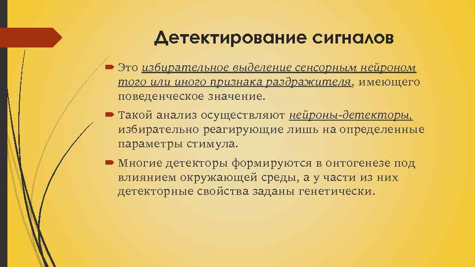 Детектирование сигналов Это избирательное выделение сенсорным нейроном того или иного признака раздражителя, имеющего поведенческое значение. Такой анализ осуществляют нейроны-детекторы, избирательно реагирующие лишь на определенные параметры стимула. Многие детекторы формируются в онтогенезе под влиянием окружающей среды, а у части из них детекторные свойства заданы генетически.