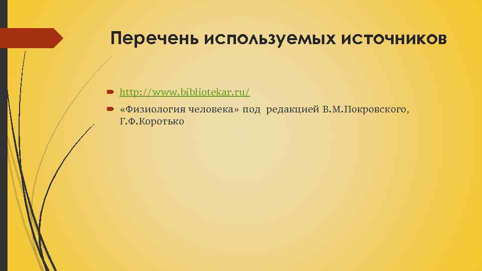 Перечень используемых источников http: //www. bibliotekar. ru/ «Физиология человека» под редакцией В. М. Покровского, Г. Ф. Коротько