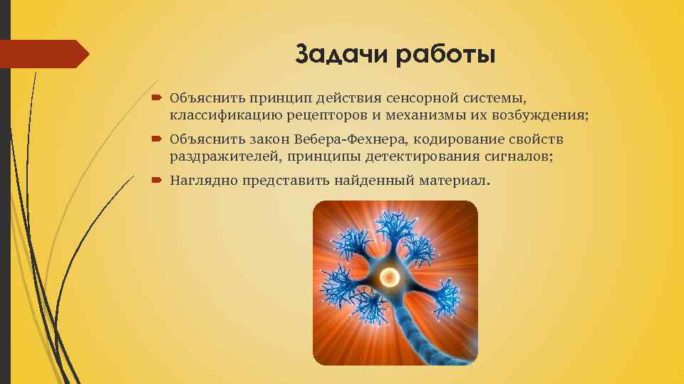 Задачи работы Объяснить принцип действия сенсорной системы, классификацию рецепторов и механизмы их возбуждения; Объяснить закон Вебера-Фехнера, кодирование свойств раздражителей, принципы детектирования сигналов; Наглядно представить найденный материал.