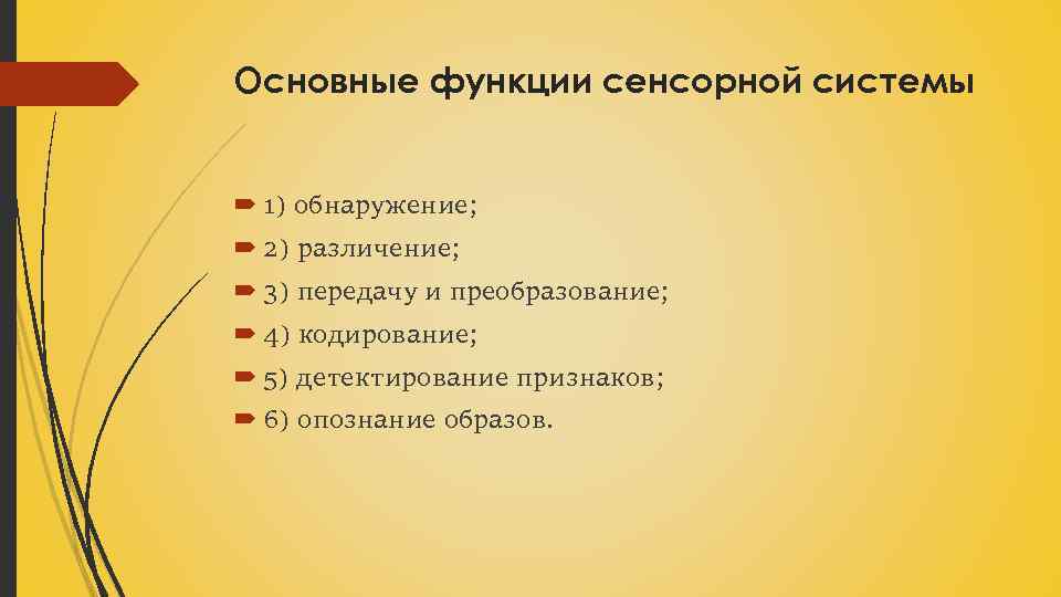 Основные функции сенсорной системы 1) обнаружение; 2) различение; 3) передачу и преобразование; 4) кодирование; 5) детектирование признаков; 6) опознание образов.