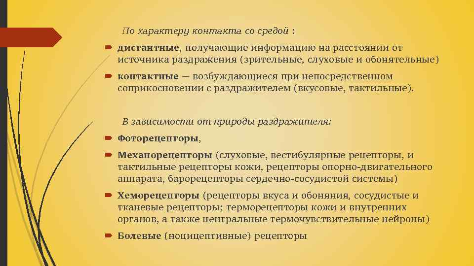 По характеру контакта со средой : дистантные, получающие информацию на расстоянии от источника раздражения (зрительные, слуховые и обонятельные) контактные — возбуждающиеся при непосредственном соприкосновении с раздражителем (вкусовые, тактильные). В зависимости от природы раздражителя: Фоторецепторы, Механорецепторы (слуховые, вестибулярные рецепторы, и тактильные рецепторы кожи, рецепторы опорно-двигательного аппарата, барорецепторы сердечно-сосудистой системы) Хеморецепторы (рецепторы вкуса и обоняния, сосудистые и тканевые рецепторы; терморецепторы кожи и внутренних органов, а также центральные термочувствительные нейроны) Болевые (ноцицептивные) рецепторы