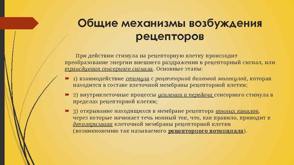 Общие механизмы возбуждения рецепторов При действии стимула на рецепторную клетку происходит преобразование энергии внешнего раздражения в рецепторный сигнал, или трансдукция сенсорного сигнала. Основные этапы: 1) взаимодействие стимула с рецепторной белковой молекулой, которая находится в составе клеточной мембраны рецепторной клетки; 2) внутриклеточные процессы усиления и передачи сенсорного стимула в пределах рецепторной клетки; 3) открывание находящихся в мембране рецептора ионных каналов, через которые начинает течь ионный ток, что, как правило, приводит к деполяризации клеточной мембраны рецепторной клетки (возникновению так называемого рецепторного потенциала).