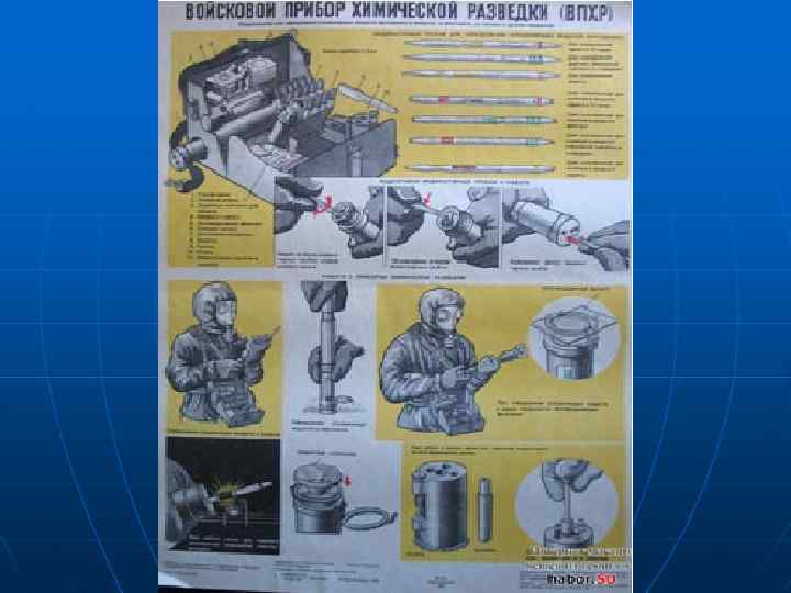 12 7 5 Устройство ВПХР 6 10 8 3 1 4 2 1 -корпус; 2 -крышка; 3 -ручной насос; 4 -кассеты с индикаторными трубками; 5 -противодымные фильтра; 6 -насадка; 7 -защитные колпачки; 8 -электрофонарь; 9 11 9 -грелка; 10 -патроны к грелке; 11 -лопатка; 12 -плечевой ремень.